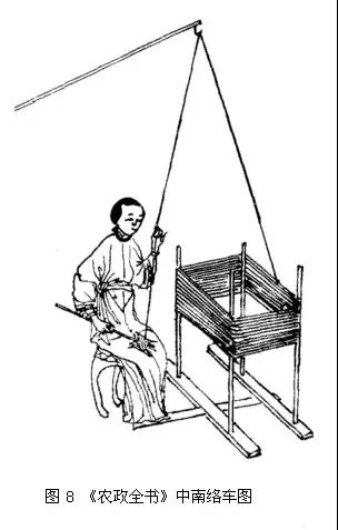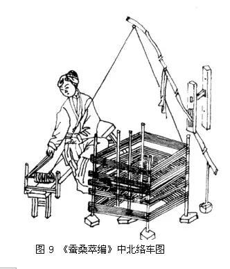 絡(luò)車是將繅車上脫下的絲絞轉(zhuǎn)絡(luò)到絲籰上的機(jī)具,它有南北絡(luò)車之分(圖8、圖9)。關(guān)于絡(luò)車的記載,《方言》有“河濟(jì)之間,絡(luò)謂之給”。郭璞注“所以轉(zhuǎn)籰給事也”。《說文》有“車柎〔fu膚〕為柅〔ni你〕”?!锻ㄋ孜摹酚小皬埥z曰柅”。這里的“柅”南北絡(luò)車通用,是張絲絞的裝置,由豎立地面上的四根木棍,或者由每兩根一組下裝底座的木棍組成。王禎《農(nóng)書》對北絡(luò)車的構(gòu)造和用法記載得比較詳細(xì),其文譯成白話是:將繅車上脫下的絲膠,張于“柅”上,“柅”上作一懸鉤,引絲緒過鉤后,逗于車上。其車之制,是以細(xì)軸穿籰,放于車座上的兩柱之間。兩柱一高一低,高柱上有一通槽,放籰軸的前端,低柱(上有一孔)放籰軸的末端。繩兜繞在籰軸上,手拉繩一引一放,則籰軸隨轉(zhuǎn),絲于是就絡(luò)在籰上了。宋應(yīng)星《天工開物》則對南絡(luò)車的構(gòu)造和用法記載得較具體,其文譯成白話是:在光線好的屋檐下,把木架鋪在地上,木架上插四根竹竿,名叫“絡(luò)篤”。絲套在四根竹上。絡(luò)篤旁邊的立柱上八尺高處,斜安一小竹竿,上面裝一個月牙鉤,絲懸掛在鉤內(nèi)。手拿籰子旋轉(zhuǎn)繞絲,以備牽經(jīng)卷緯時用。小竹竿的一頭墜石,成為活頭,接斷絲時,一拉繩小鉤就可落下。對比兩書記載,南北絡(luò)車都用張絲的“柅”和卷繞絲線的“籰”,但絲上籰的方式兩者卻是大不相同。北絡(luò)車是用右手牽繩掉籰,左手理絲,繞到籰上;南絡(luò)車則是用右手拋籰,左手理絲,繞到籰上。由于北絡(luò)車轉(zhuǎn)籰動作采取了機(jī)械方式,絲籰旋轉(zhuǎn)速度快而穩(wěn),所以它的生產(chǎn)效率和絡(luò)絲質(zhì)量遠(yuǎn)較南絡(luò)車為優(yōu),古人所謂“南人掉籰取絲,終不若絡(luò)車安而穩(wěn)也”的評論,正是對此而言。