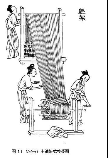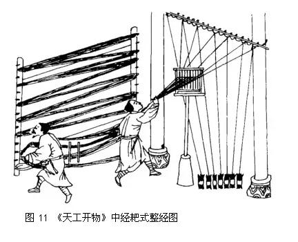 軸架式整經(jīng)工具始見于樓璹〔shu贖〕《耕織圖》中,那上面所載圖文雖過于簡單,但表明至晚在南宋時就已普遍使用這種整經(jīng)工具了。其后元代的《農(nóng)書》、明代的《農(nóng)政全書》、清代的《豳風(fēng)廣義》等一些書籍記載得較為詳盡,使我們可以知道它的全貌。根據(jù)這些記載,軸架式整經(jīng)是將絲籰整齊排列在一有小環(huán)的橫木下,引出絲緒穿過小環(huán)和掌扇繞在經(jīng)架上(經(jīng)架的形制是兩柱之間架一大絲框,框軸固連一手柄)。一人轉(zhuǎn)動經(jīng)架上手柄,一人用掌扇理通紐結(jié)經(jīng)絲,使絲均勻地繞在大絲框上后,再翻卷在經(jīng)軸上(圖11)。這種經(jīng)具與經(jīng)耙式相比,不僅產(chǎn)量高、質(zhì)量有保證,而且對棉、毛、絲、麻等纖維都適用,故一直習(xí)用至近代。它的工作原理與近代大圓框式的自動整經(jīng)機(jī)完全一致。