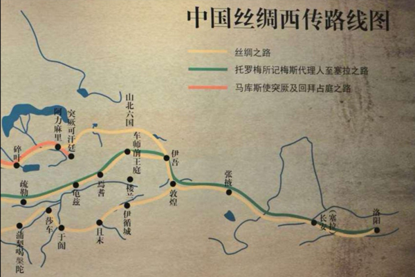 其實,古代絲綢之路的路線并不固定,也非只有一條,其主要路線為:東起渭水流域,向西通過河西走廊,在敦煌分成兩路:一路經(jīng)今新疆境內(nèi)塔里木河北面的通道,在疏勒以西越過蔥嶺,經(jīng)大宛和康居南部西行;另一路經(jīng)今新疆境內(nèi)塔里木河南面的通道,在莎車以西越過蔥嶺,經(jīng)大月氏西行。以上兩路會于安息,然后向西經(jīng)條支到達大秦。全長6000多千米。