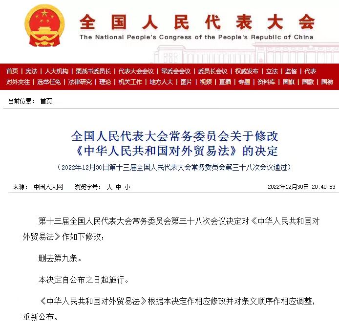 2022年12月30日發(fā)布的全國人民代表大會常務(wù)委員會關(guān)于修改《中華人民共和國對外貿(mào)易法》的決定稱,第十三屆全國人民代表大會常務(wù)委員會第三十八次會議決定對《中華人民共和國對外貿(mào)易法》作出“刪去第九條”的修改。本決定自公布之日起施行。