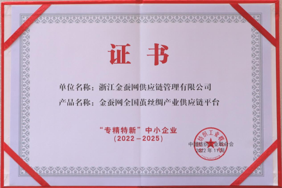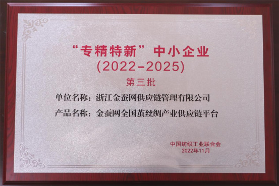 金蠶網(wǎng)以“金蠶網(wǎng)全國(guó)繭絲綢產(chǎn)業(yè)供應(yīng)鏈平臺(tái)“特色產(chǎn)品,憑借“建設(shè)金蠶網(wǎng)供應(yīng)鏈服務(wù)專業(yè)化信息平臺(tái)、建設(shè)金蠶網(wǎng)供應(yīng)鏈服務(wù)精細(xì)化物流體系、建設(shè)繭絲綢行業(yè)特色化大數(shù)據(jù)系統(tǒng)與信息溯源平臺(tái)、建設(shè)供應(yīng)鏈融資支持體系、促進(jìn)供應(yīng)鏈各項(xiàng)業(yè)務(wù)有機(jī)融合、引導(dǎo)行業(yè)企業(yè)積極融入雙循環(huán)發(fā)展、促進(jìn)蠶農(nóng)增收帶動(dòng)共同富?!钡劝隧?xiàng)專精特新重要做法成功入選第三批紡織行業(yè)“專精特新”中小企業(yè)名單,朱雪鳳副總經(jīng)理代表金蠶網(wǎng)領(lǐng)取中國(guó)紡織工業(yè)聯(lián)合會(huì)頒發(fā)的獎(jiǎng)牌和證書。