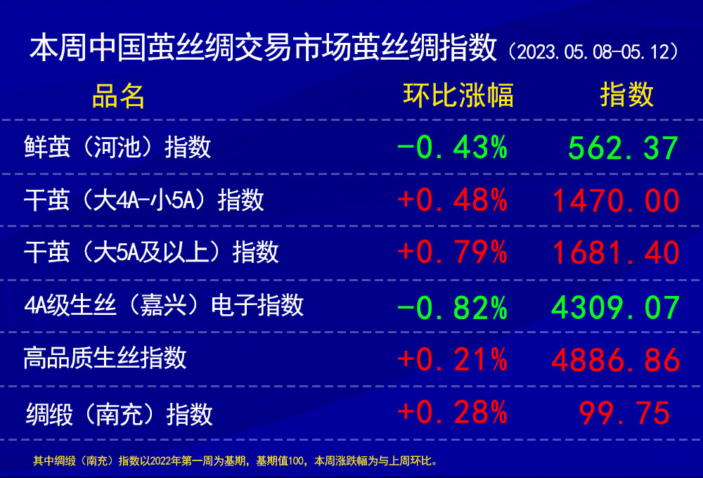 絲價(jià)收紅 本周繭絲綢指數(shù)以上漲為主(20230512)