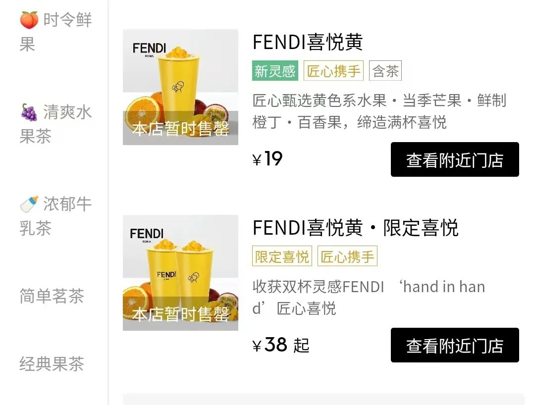 這杯聯(lián)名奶茶,背身采用標(biāo)志性的FENDI黃,再印有品牌LOGO,但只有19塊,真不貴。查了下工作附近的店,又隨便查了北京上海的店。售罄,沒(méi)有二話(huà)。
