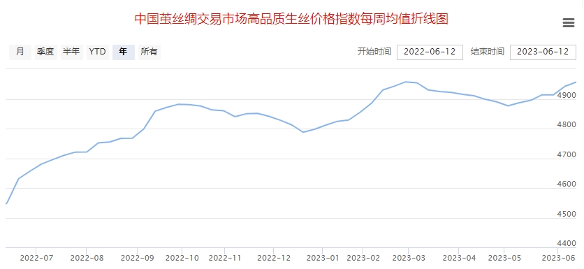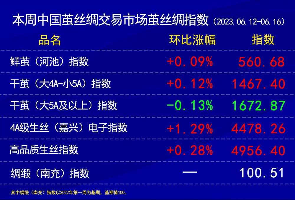 今日(2023年06月16日,周五)中國繭絲綢交易市場生絲指數(shù)微跌0.07%收于4478.26點(diǎn),本周生絲指數(shù)上漲1.29%。B絲(商檢4A級(jí)生絲):230625合約下跌0.06萬元報(bào)收于44.34萬元;230925合約報(bào)平收于44.64萬元;240325合約上漲0.15萬元報(bào)收于45.75萬元。