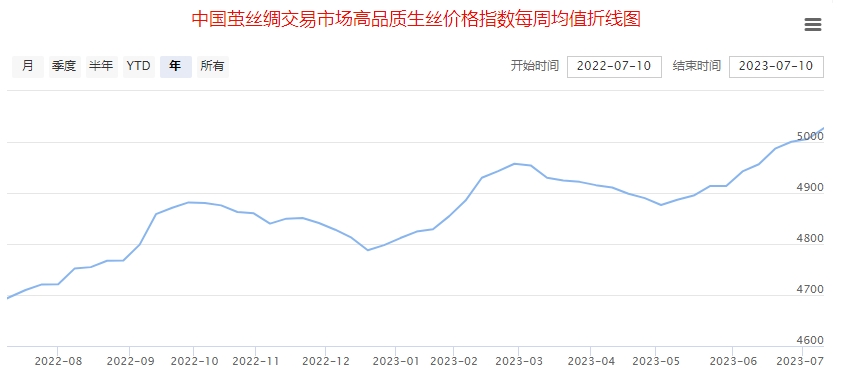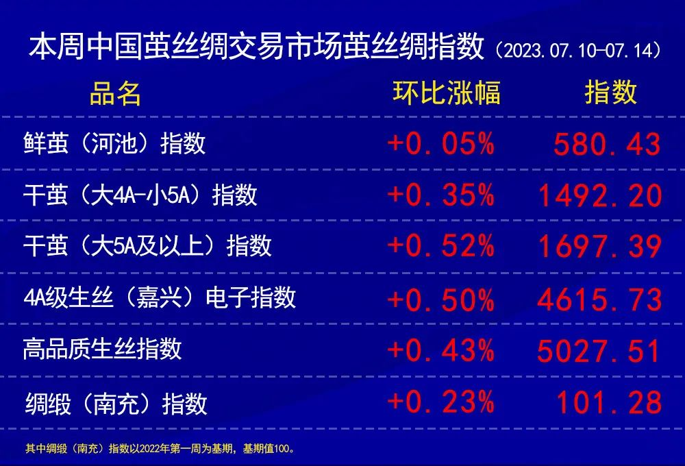 今日(2023年07月14日,周五)中國繭絲綢交易市場生絲指數上漲0.53%收于4615.73點,本周生絲指數上漲0.50%。B絲(商檢4A級生絲):230725合約上漲0.24萬元報收于45.69萬元;230925合約上漲0.24萬元報收于45.90萬元;240325合約上漲0.45萬元報收于47.22萬元。