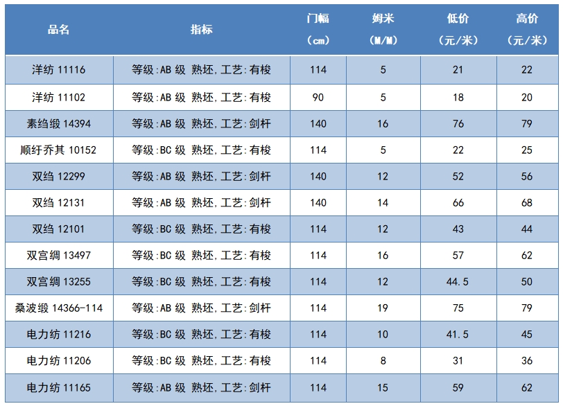 從杭嘉湖片綢緞生產來看,部分企業(yè)反映有外貿訂單下達,整體也是處于內外銷淡季狀態(tài)。價格上基本保持不變,部分庫存較少流動性較好的企業(yè)根據絲本對面料價格有略上調。面料批發(fā)市場上,今年提花、傳統晾曬和新香云紗面料的銷售相對仍是亮點。