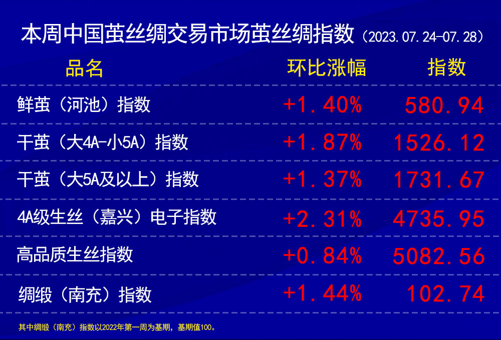 今日(2023年07月28日,周五)中國繭絲綢交易市場生絲指數(shù)微跌0.03%收于4735.95點(diǎn),本周生絲指數(shù)上漲2.31%。B絲(商檢4A級生絲):230825合約上漲0.09萬元報(bào)收于47.07萬元;230925合約下跌0.27萬元報(bào)收于47.43萬元;240325合約下跌0.30萬元報(bào)收于48.48萬元。
