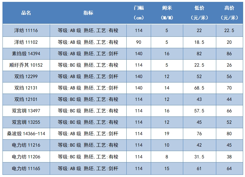 本周綢緞指數(shù)協(xié)作單位成交價(jià)格區(qū)間