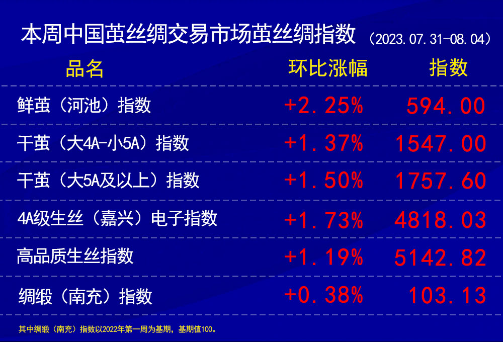 今日(2023年08月04日,周五)中國(guó)繭絲綢交易市場(chǎng)生絲指數(shù)上漲0.26%收于4818.03點(diǎn),本周生絲指數(shù)上漲1.73%。B絲(商檢4A級(jí)生絲):230825合約上漲0.15萬(wàn)元報(bào)收于47.97萬(wàn)元;230925合約上漲0.15萬(wàn)元報(bào)收于48.27萬(wàn)元;240325合約上漲0.09萬(wàn)元報(bào)收于49.14萬(wàn)元。