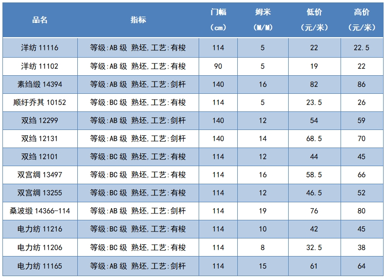 本周綢緞指數(shù)協(xié)作單位成交價格區(qū)間