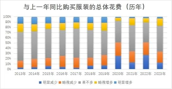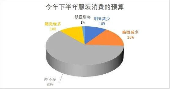 對于后續(xù)在服裝上的消費(fèi)預(yù)算,有26.01%的受訪者表示會減少,有62.46%的受訪者表示沒有變化,有11.53%的受訪者表示會增加。這一數(shù)據(jù)與去年的調(diào)查數(shù)據(jù)相比也是有了明顯的改觀,說明消費(fèi)信心在逐步恢復(fù)中。