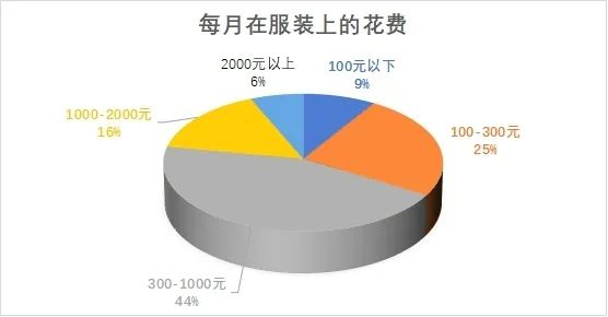 受訪的消費(fèi)者中有34.01%的人表示在服裝上的總體消費(fèi)是減少了的,其中12.9%還是明顯減少的。僅有16.82%的受訪者表示消費(fèi)在增加。這一數(shù)據(jù)好于去年,但是不及疫情前的數(shù)據(jù)。對于每個月用在服裝上的花費(fèi),大多數(shù)受訪者選擇了在300-1000元之間,這一比例占到44.28%,其次是100-300元之間,這一比例是24.73%。從近幾年調(diào)查的數(shù)據(jù)看,去年是個低谷,目前的消費(fèi)能力在逐步恢復(fù)中。