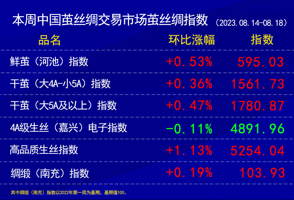 鮮繭指數(shù)上,本周由廣西百色和廣東等區(qū)外夏繭收購至廣西的數(shù)據(jù)組成,質(zhì)量指標(biāo)偏差,轉(zhuǎn)換成基準(zhǔn)價格指數(shù)后環(huán)比上漲0.53%。