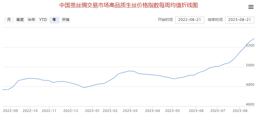今日(2023年08月25日,周五)中國繭絲綢交易市場生絲指數(shù)下跌0.16%收于4878.78點,本周生絲指數(shù)下跌0.27%。B絲(商檢4A級生絲):230925合約下跌0.03萬元報收于48.96萬元;240325合約下跌0.12萬元報收于48.93萬元;240925合約下跌0.03萬元報收于48.27萬元。